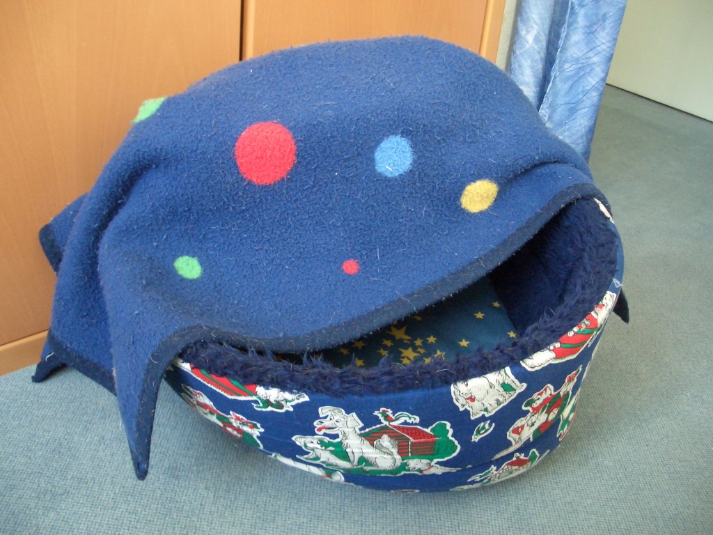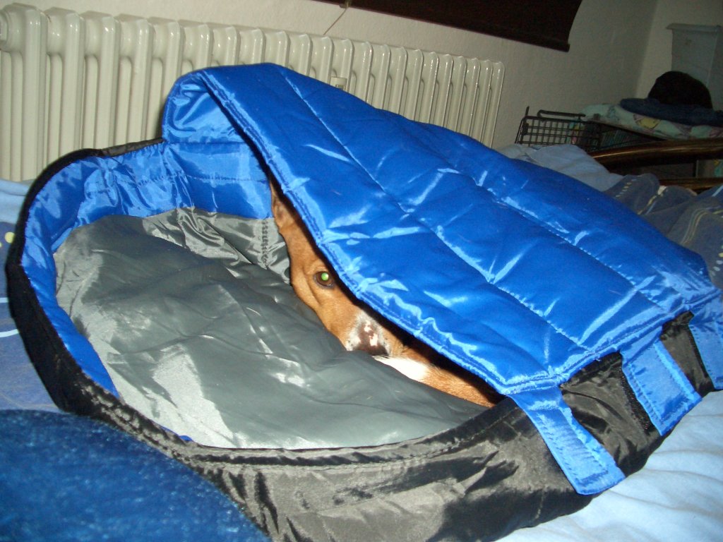 Seit gestern hat Bari einen neuen Schlafplatz für Unterwegs, einen Hundeschlafsack ;D, nimmt nicht so viel Platz weg, wie seine Kuschelhöhle (Bild 1), läßt sich recht klein zusammenrollen.